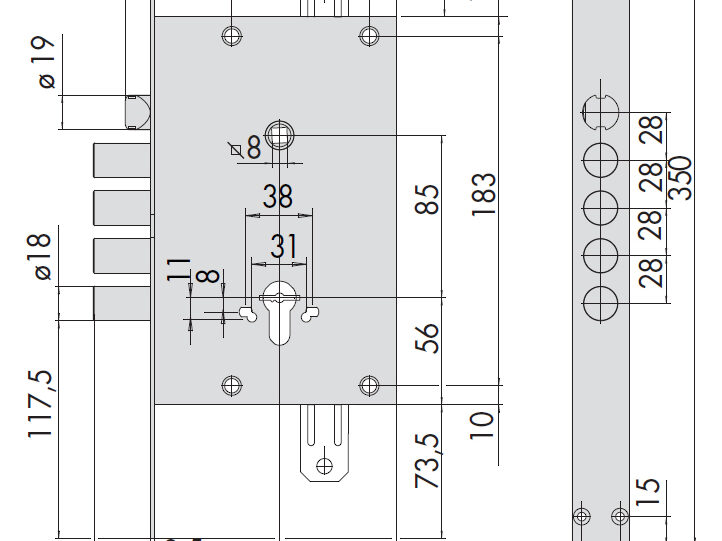- Deadbolt centrum gevormd door 4 verankeringspunten van Ø 18 mm