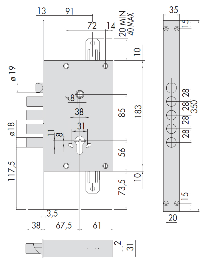 - Deadbolt centrum gevormd door 4 verankeringspunten van Ø 18 mm