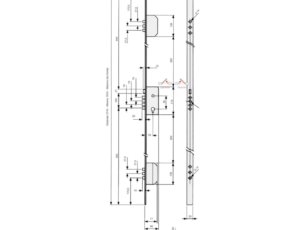 - Ankerpunten : Een centraal nachtschoot met vier Ø 14 mm cilinders, twee sets van drie Ø 14 mm nachtschieters op +/- 645 mm van de boven- en onderkant van de centrale behuizing.