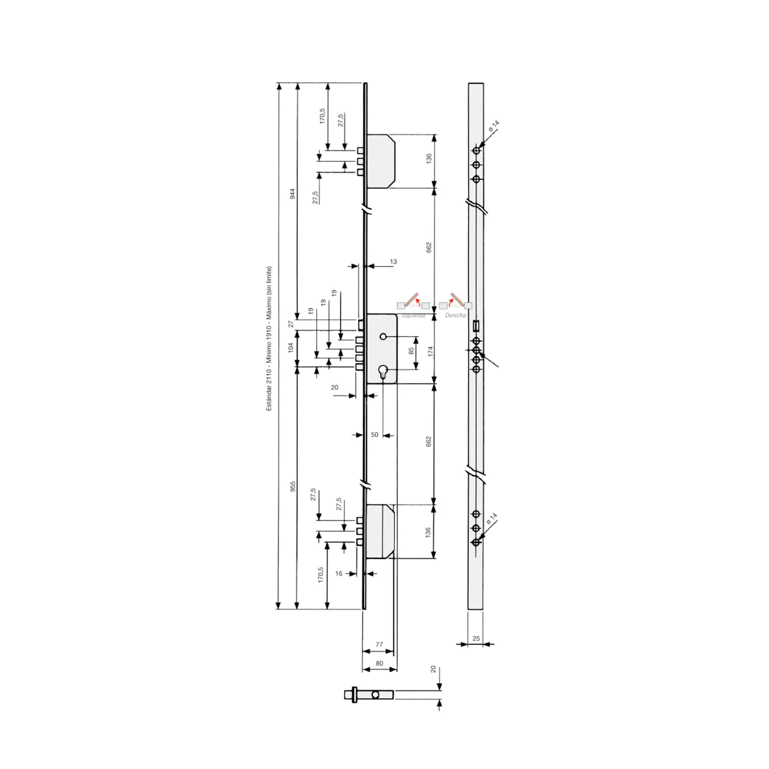 - Reizen van centrale ankers : 20 mm in 2 omwentelingen van de sleutel