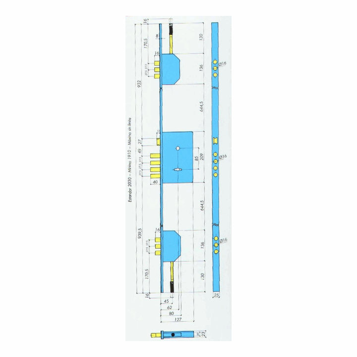 - Centraal nachtslot : Bestaat uit vier Ø 16 mm cilinders, twee sets van drie Ø 16 mm nachtschieters die op +/- 645 mm naar boven en onderen van de centrale behuizing zijn geplaatst.
