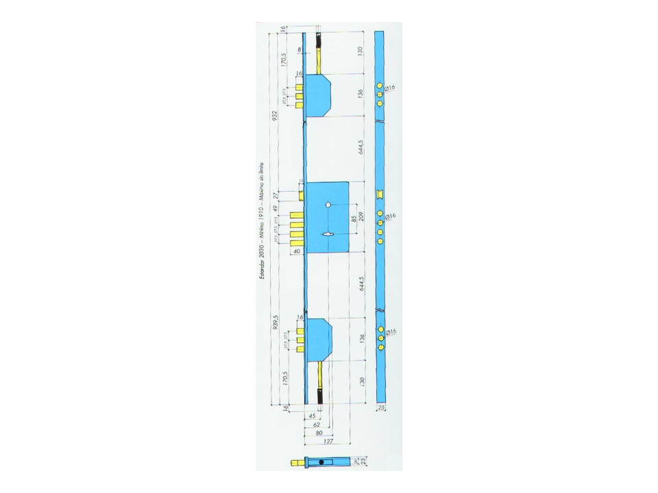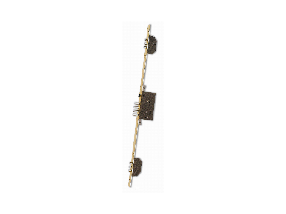 - Centraal nachtslot : Bestaat uit vier Ø 16 mm cilinders, twee sets van drie Ø 16 mm nachtschieters die op +/- 645 mm naar boven en onderen van de centrale behuizing zijn geplaatst.