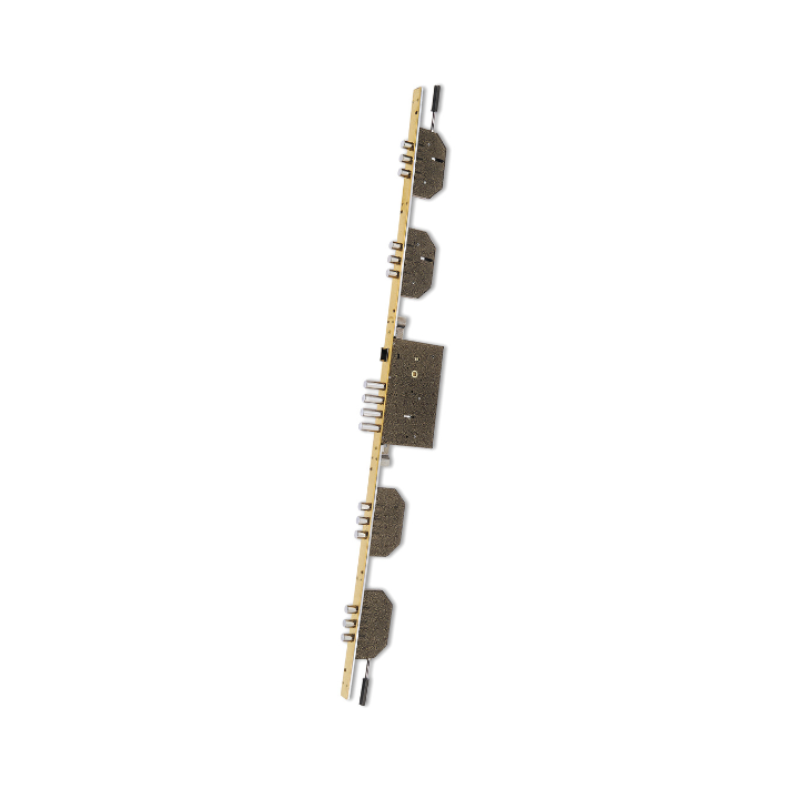 • Centraal nachtslot : Bestaande uit vier cilinders van Ø 16 mm, twee sets van drie nachtschieters van Ø 16 mm die op +/- 645 mm naar de boven- en onderkant van de centrale behuizing zijn geplaatst en twee sets van drie nachtschieters van Ø 16 mm die op +/- 200 mm zijn geplaatst.